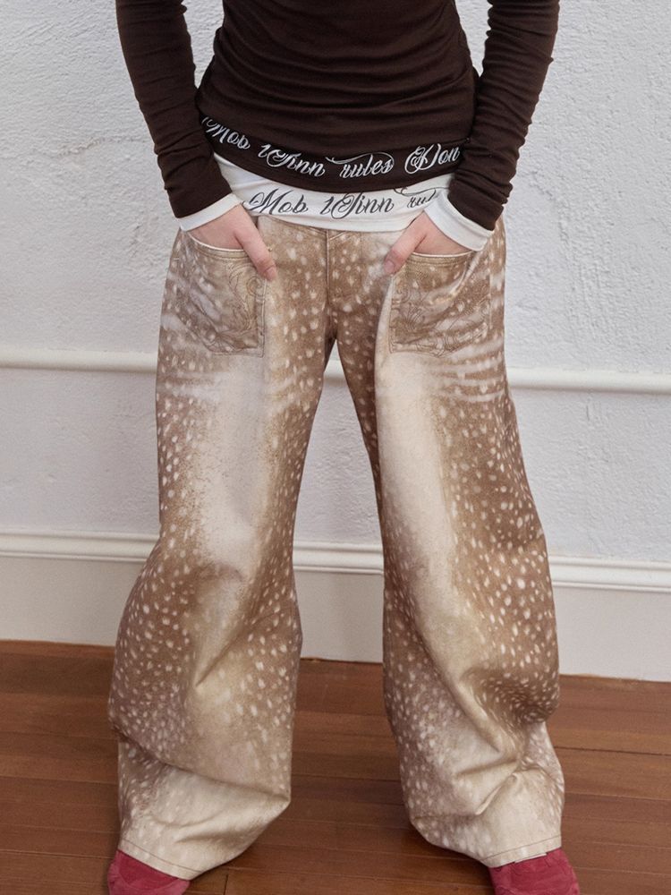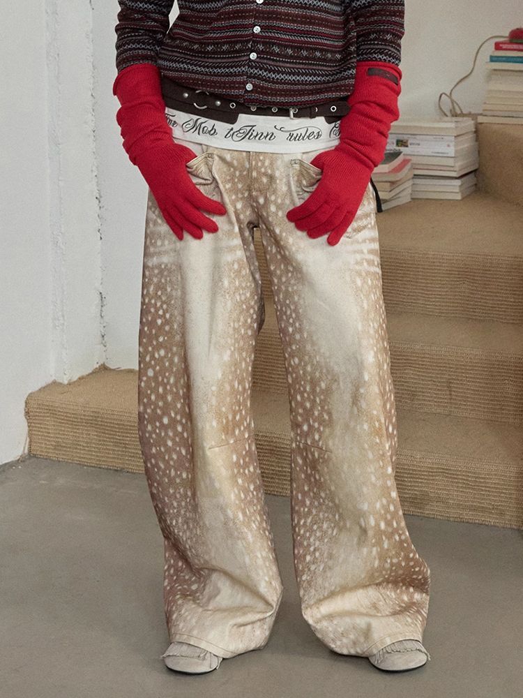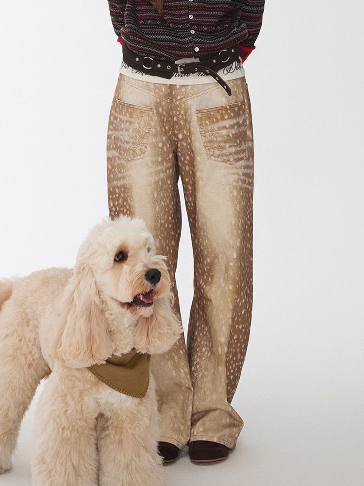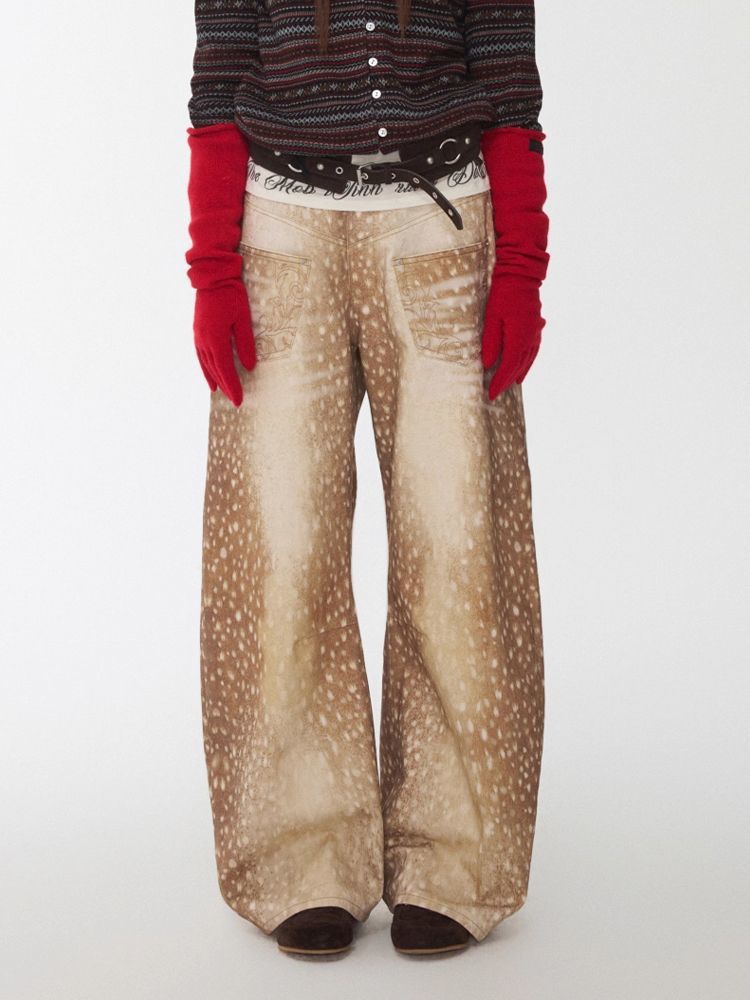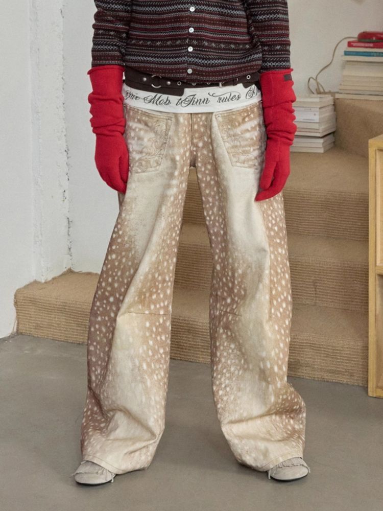 Retro Plus-size Distressed Faux-Aged Deer Print Denim Jeans