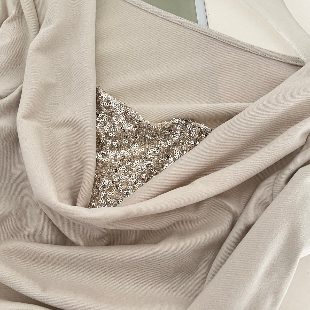 Women's Champagne Gold Sequin Two-Piece Evening Gown Set Ruched Top Mermaid Skirt Formal Party Dress